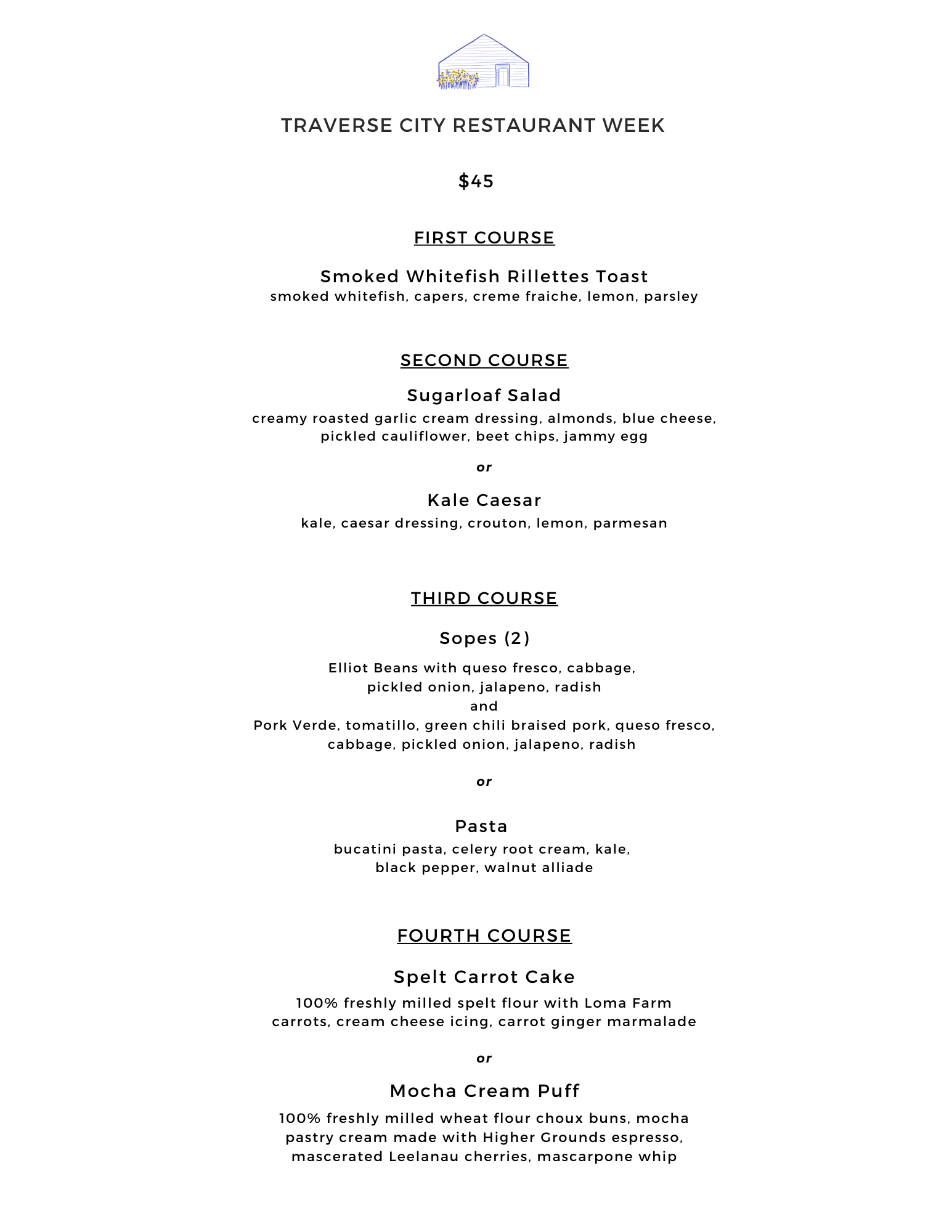 Now accepting reservations for Traverse City Restaurant Week. Enjoy a 3 course menu that highlights the very best of the provisions from our farm, mill, bakery and brewery. Dinner service only. $45/person. Limited reservations. Book now.